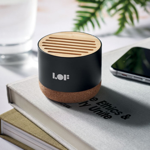 Сучасна бездротова колонка з підтримкою Bluetooth 5.3 поєднує стильний дизайн та екологічний підхід до виробництва. Корпус виготовлений із переробленого алюмінію, доповнений корковою основою та бамбуковим оздобленням верхньої частини, що надає виробу природної естетики та преміального вигляду.